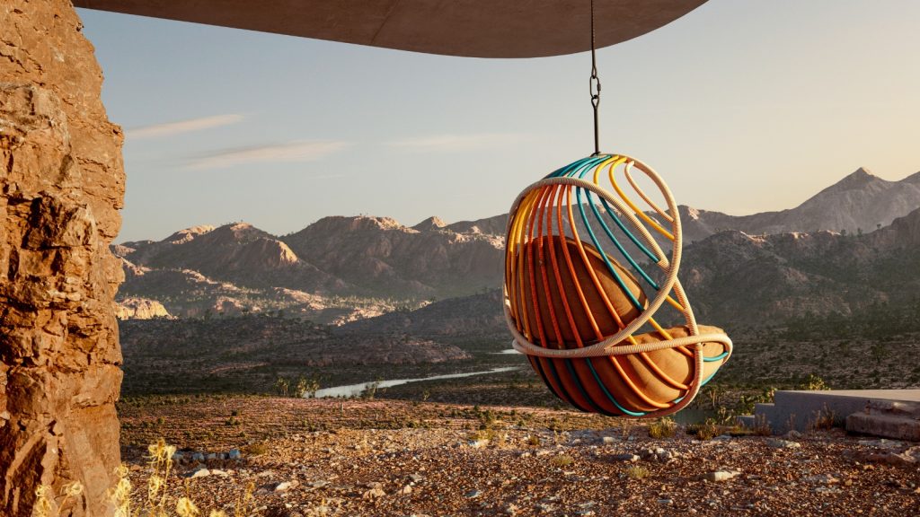 Hanging chairs for outdoor spaces, providing a fun and relaxing swing seat with durable rope and frames.