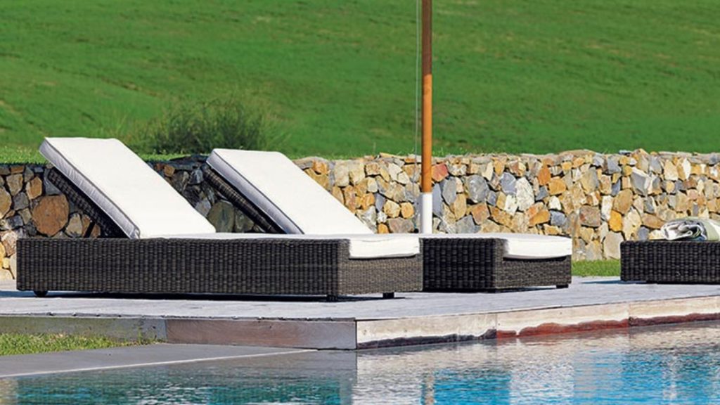 Sun loungers and chaise loungers with adjustable backs and comfortable surfaces, perfect for poolside relaxation.