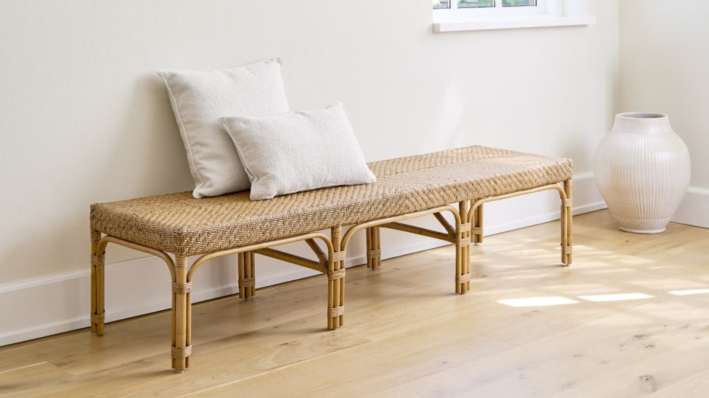 Rattan benches and poufs that serve as versatile seating or footrests, blending natural aesthetics with comfort.