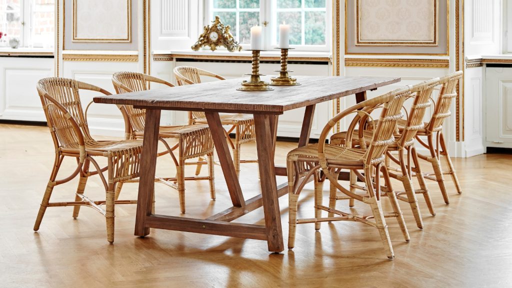 Dining chairs crafted from natural rattan for a relaxed, tropical feel; lightweight yet sturdy for indoor and covered outdoor use.