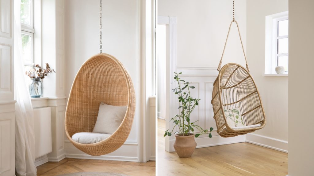 Hanging chairs made from rattan, offering a playful and relaxing spot for reading or lounging.